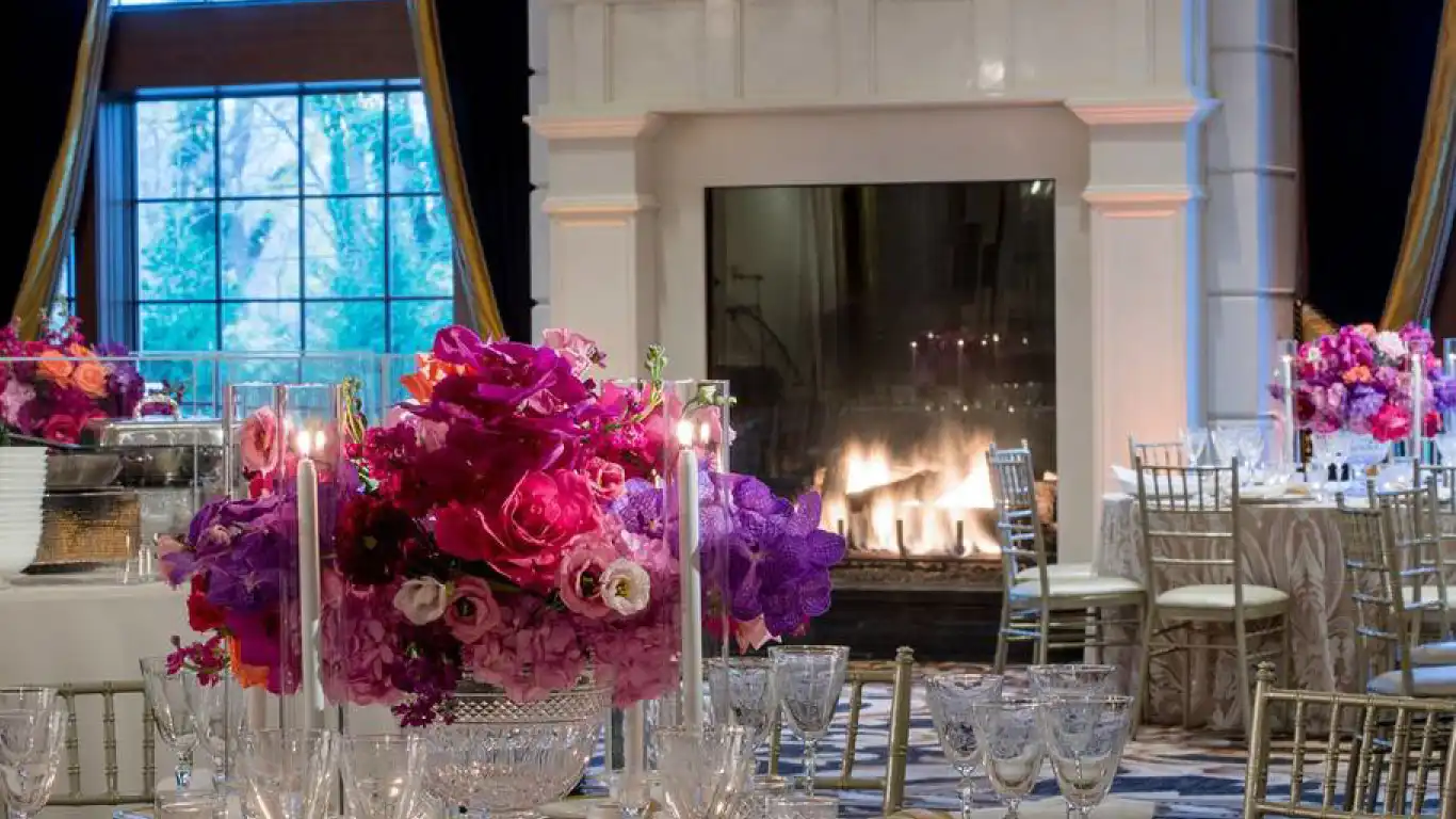 a photo of the four seasons dallas resort patio with a large open view fireplace with gas logs